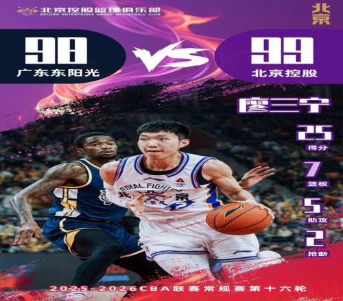 1月17日,北控男篮南下广东首个客场对阵广东东阳光。本场比赛,双方经历了全程势均力敌的缠斗,凭借廖三宁最后阶段精准中投以及压哨神仙球,北控男篮以99:98绝杀广东东阳光。